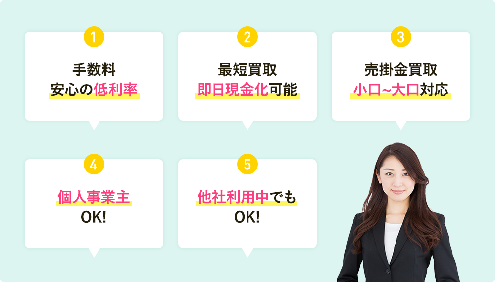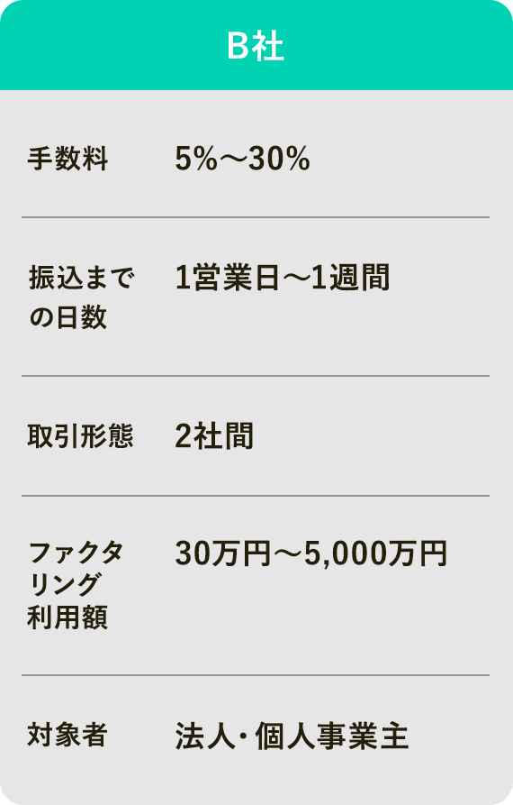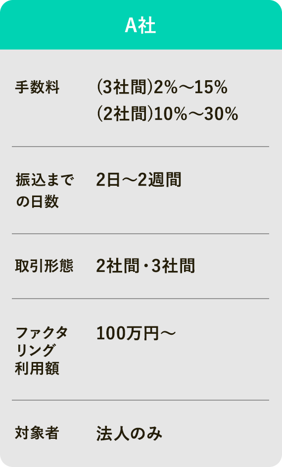 ファクタリング利用額 30万円〜無制限ファクタリング利用額 100万円〜ファクタリング利用額 30万円〜5,000万円