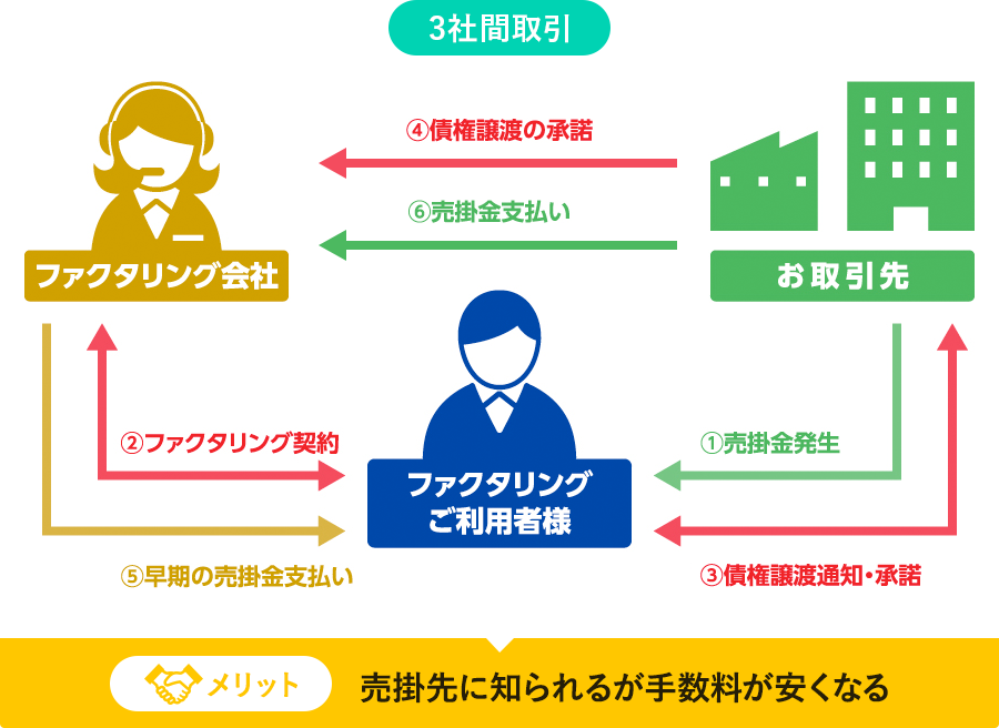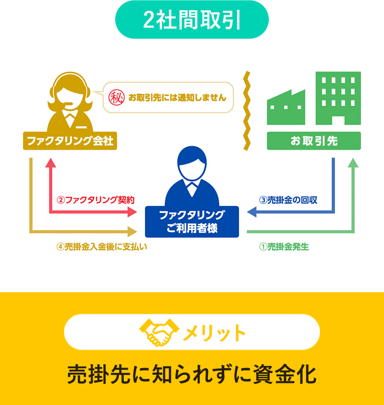 ファクタリングの契約には、2社間取引(お客様と当社のみで契約)と3社間取引(お客様、売掛先、当社の3社で契約)があります。現在は2社間取引を選ばれるお客様が多くなっていますが、双方に違ったメリットがありますので、取引の流れを分かりやすく図式化しました。